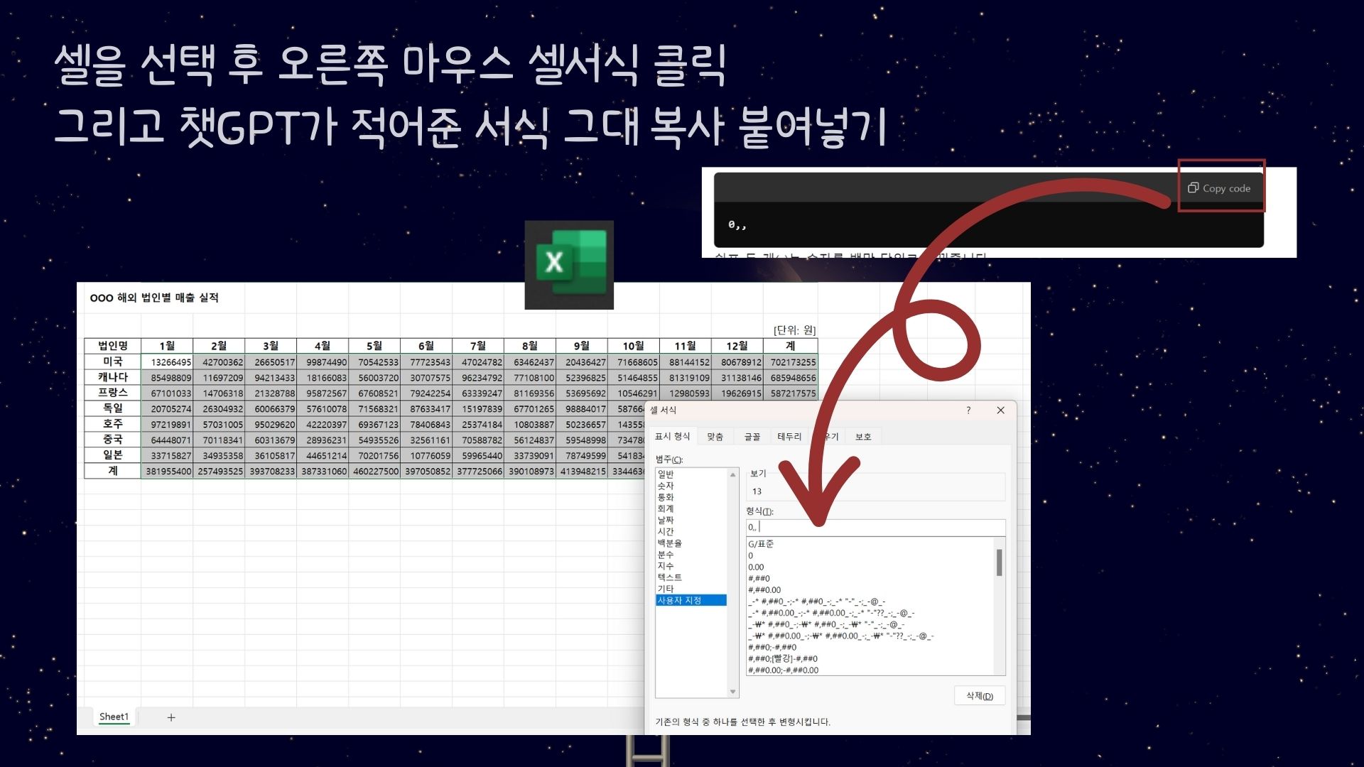 챗GPT에게 앱스 스크립트 작성 요청하기: 챗GPT가 작성해 준 코드를 스프레드시트에 붙여넣습니다.