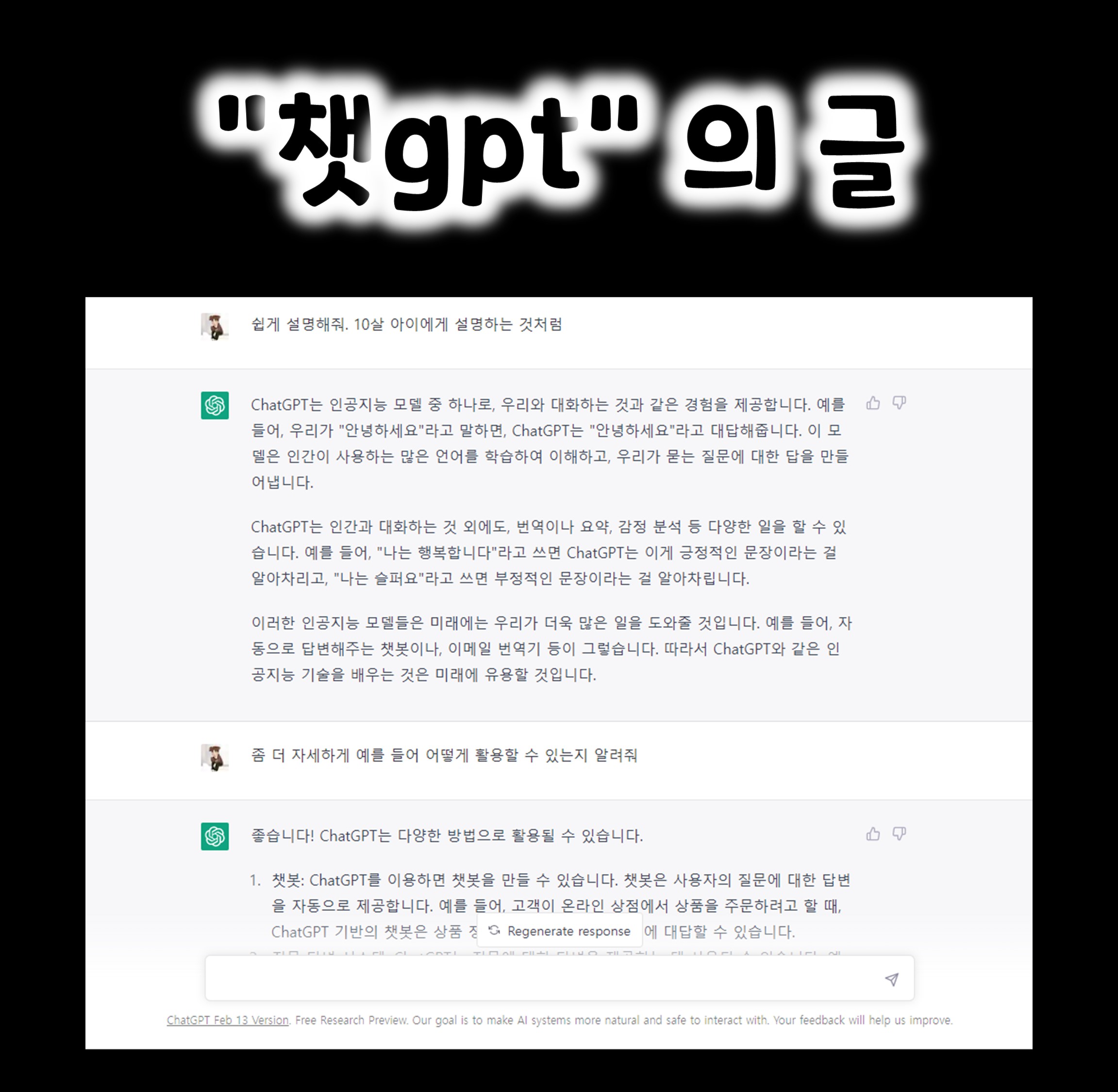 저는 챗GPT에게 챗gpt에 대해 쉽게 열 살 아이게게 설명하는 것처럼 알려달라고 질문을 했습니다.