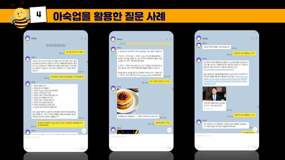 그리고 얼마 안 돼 노션AI, 뤼튼 등 각종 듣도 보도 못한 AI에 대한 소식과 기사가 연이어 등장합니다. 23 3월에 아숙업 (AskUp) 서비스가 우리의 카톡창에 들어왔습니다.